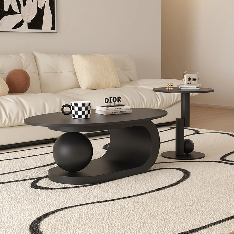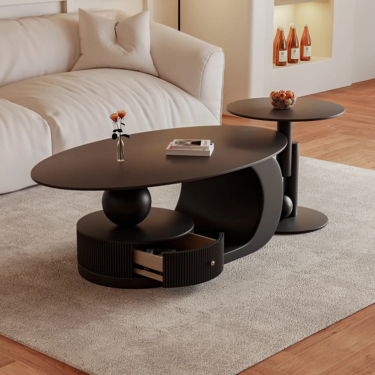 Modern Oval Slate Top Coffee Table with Metal Base and Drawer